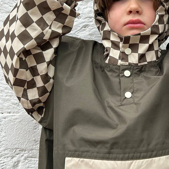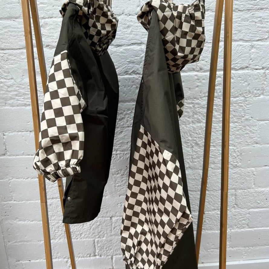 Ce poncho de pluie kaki damiers est là pour vous redonner le sourire même sous une pluie battante ! Fini le poncho classique et triste – voici la cape qui va faire sensation partout où vous irez !