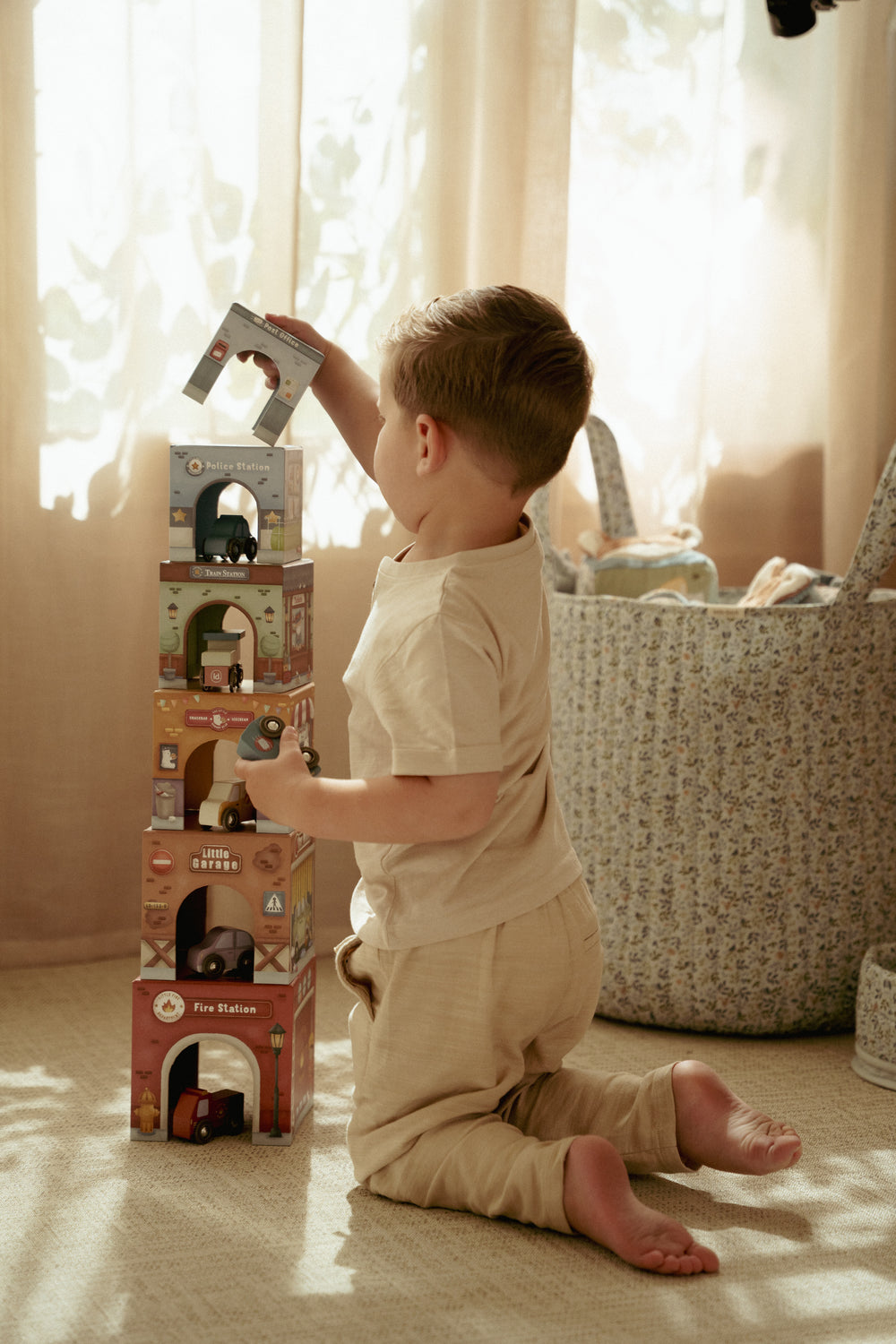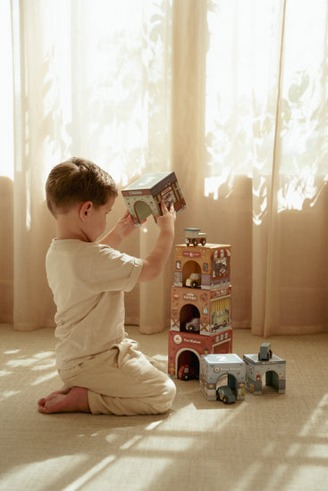 Empilez, construisez et explorez ! Cet ensemble de 6 blocs en carton, décorés de véhicules assortis, offre d'innombrables possibilités de jeu. Les enfants peuvent les empiler pour créer de hautes tours ou les disposer sur le circuit de train XL afin que les véhicules puissent passer dessous facilement. Chaque bloc présente des illustrations uniques et est accompagné d’un véhicule correspondant, parfaitement adapté à sa taille. Une manière ludique de stimuler l’imagination, la coordination et la motricité fine !