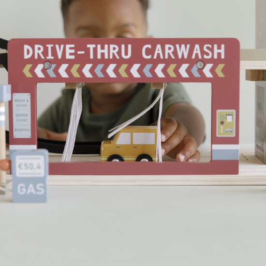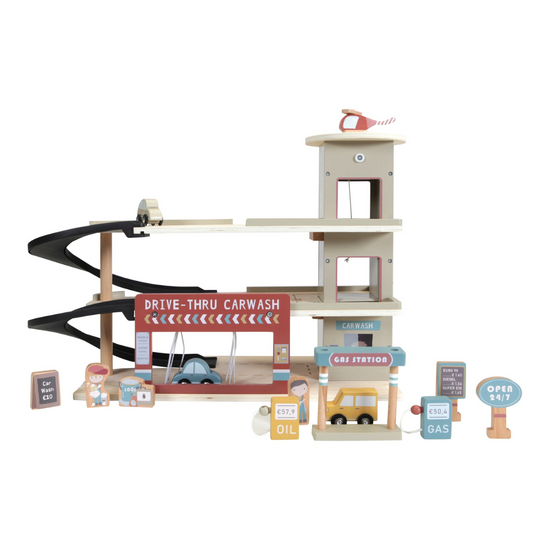Quoi de plus pratique qu’un garage pour faire le plein, se garer ou laver la voiture ? L’extension comprend un garage avec une station de lavage, des voitures, un hélicoptère, une station essence, des pompes, des panneaux et des mécaniciens. Ce garage en bois est l’une des nombreuses extensions du circuit de train Little Dutch. Le garage est fourni avec une plate-forme d’hélicoptère et des figurines en bois. Toutes les pièces sont finement décorées des deux côtés.