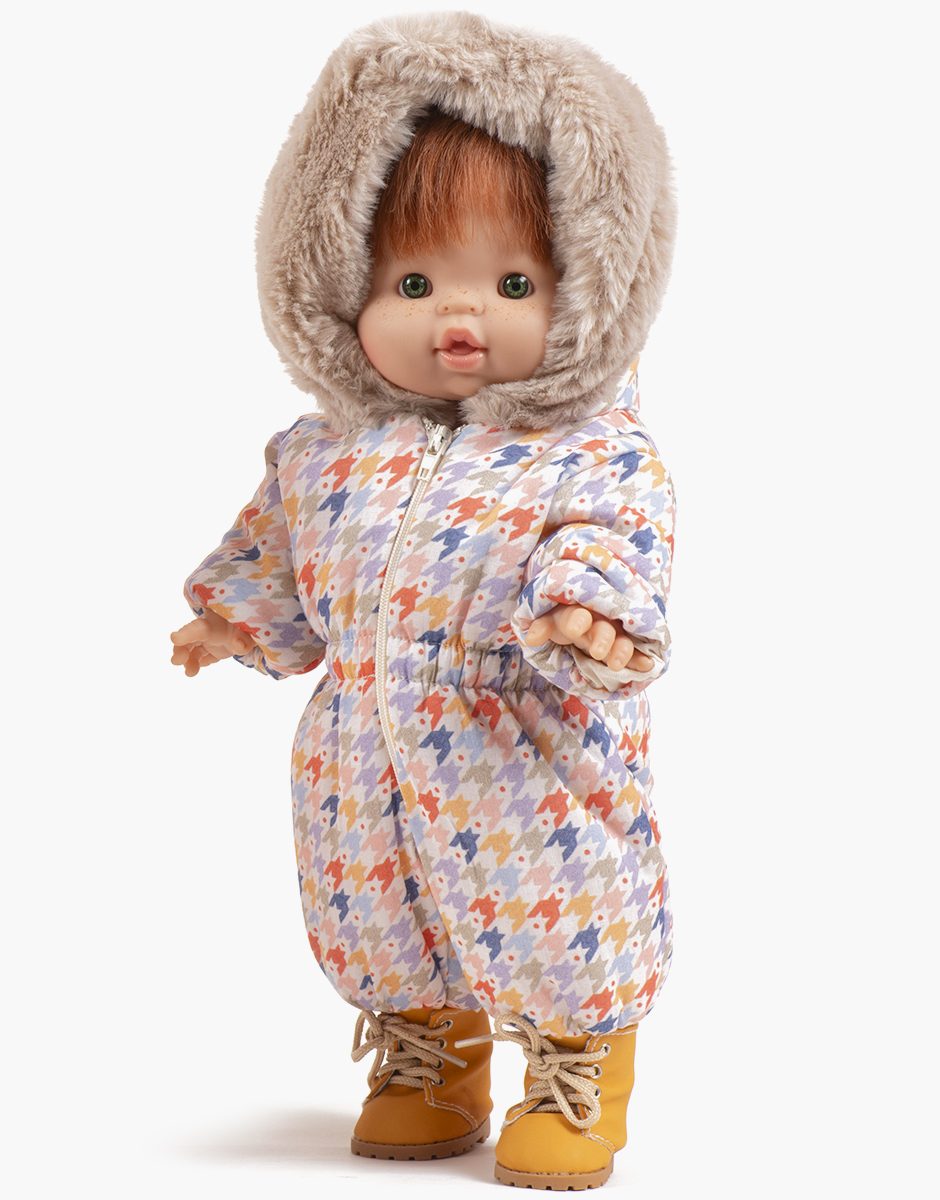 Combinaison de ski Gigi et sa capuche avec bord en fausse fourrure pour poupées et poupons Minikane Gordis 34 & 37cm.