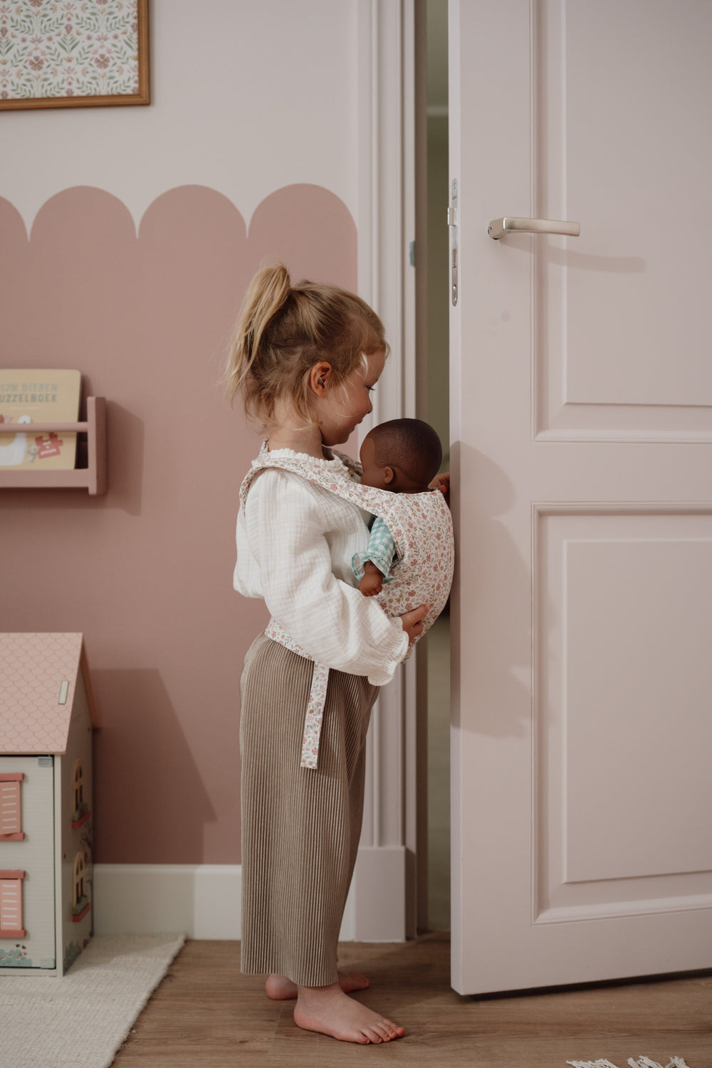Ce ravissant porte-bébé fleuri permet aux enfants de porter leur poupée comme de vrais parents. Facile à enfiler et ajustable, il offre un maintien confortable grâce à ses bretelles rembourrées et sa fermeture sécurisée. Accessoire idéal pour stimuler l’imagination et accompagner les jeux d’imitation au quotidien.