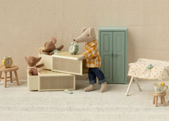 Un classique Maileg : cette souris mi-endormie/mi-éveillée est prête pour des heures de jeux et dormira au chaud dans sa boîte assortie. Les vêtements et le linge sont fabriqués dans des tissus doux aux imprimés uniques.
